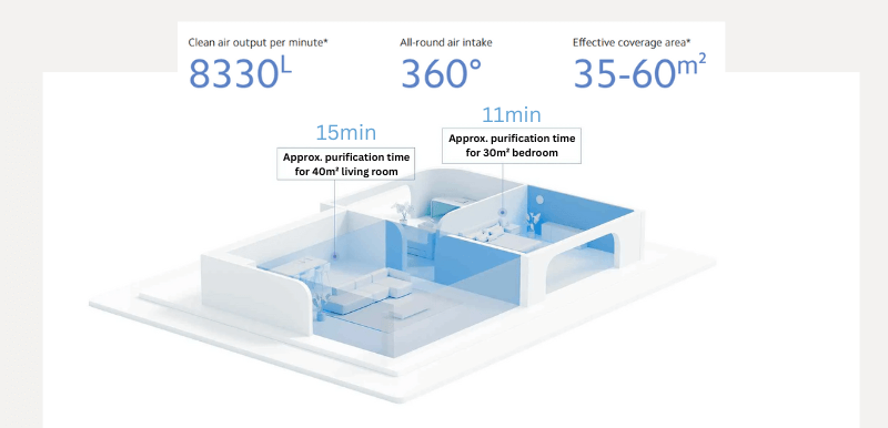 Another key benefit is its fantastic Clean Air Delivery Rate (CADR) at 400 m³/h for particulate matter and 150 m³/h for formaldehyde. In simpler terms, that means the purifier will wash the air in a 48-square-meter room in minutes.