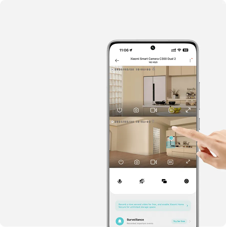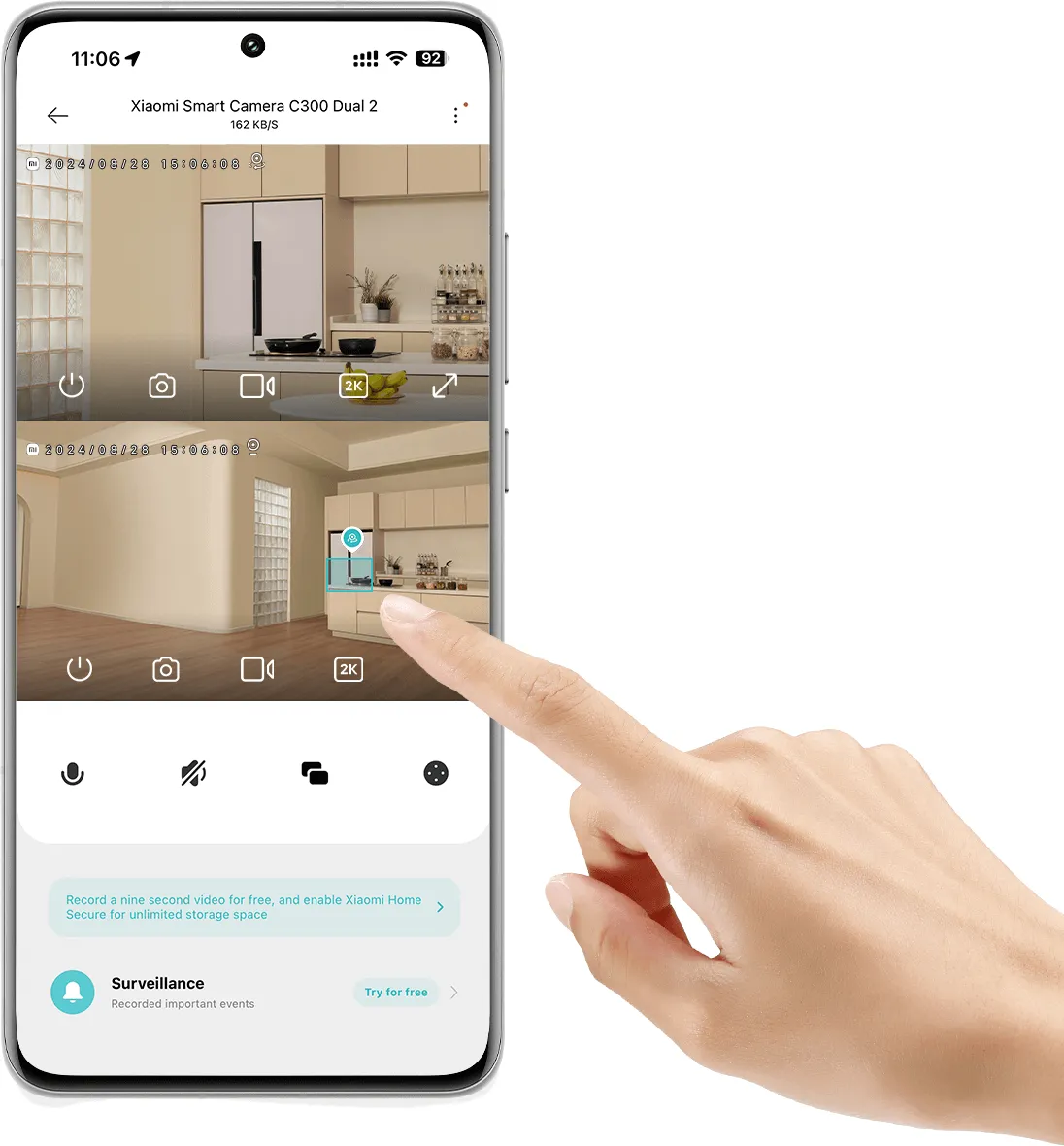 Tap and hold anywhere on fixed camera footage and the PTZ camera will automatically swivel and zoom in. Users can use the Xiaomi Home app to track important details.